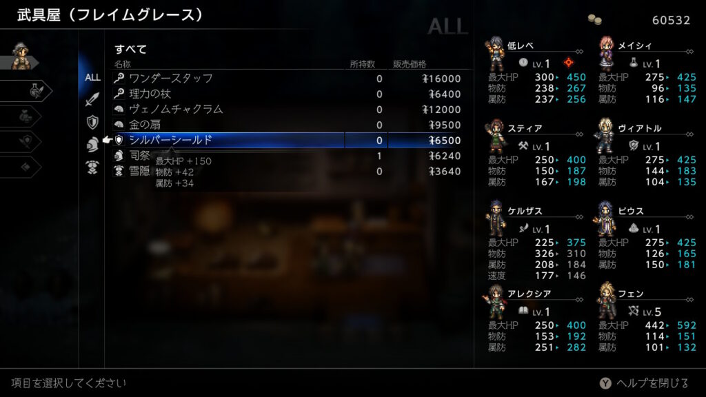 とりあえず前回の反省を生かして全員にHP+150のシルバーシールドを装備させてHPを底上げ(元が低すぎる…)しています。