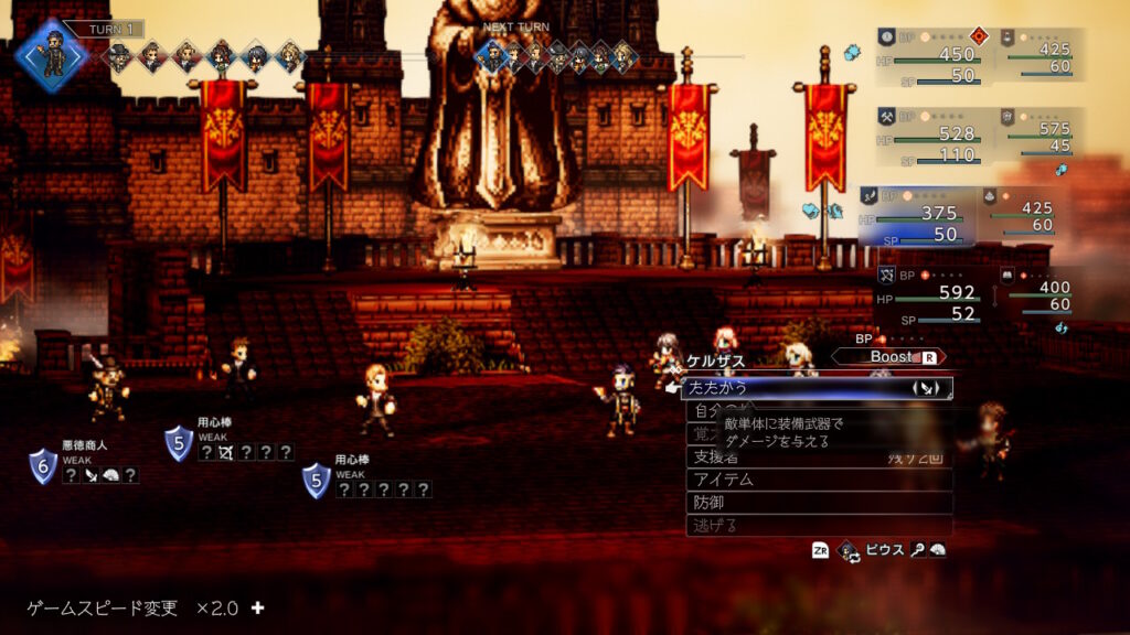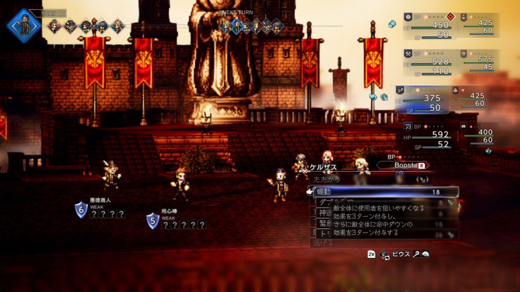 今回もケルザス煽動から開始して2回煽動をかけて命中デバフを入れています、正直HPが少し増えているだけでも前回よりクッソ安定しました。