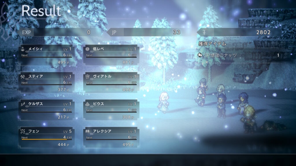仕留めきれずにアレクシア落ちとるやんけ、メイシィがおいしいところを持って行ったリザルト画面(ナッツは今のところ使えない縛りなので特に盗むとかも気にしていません)