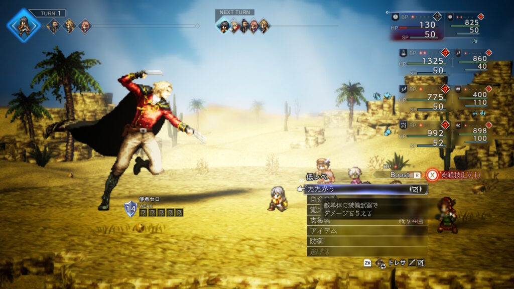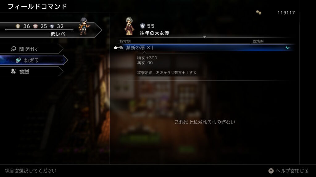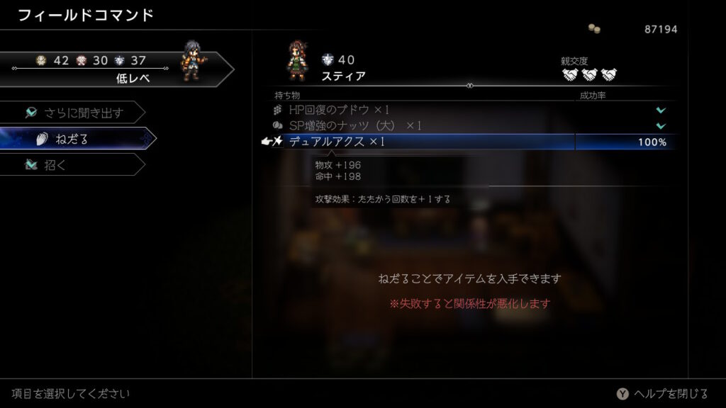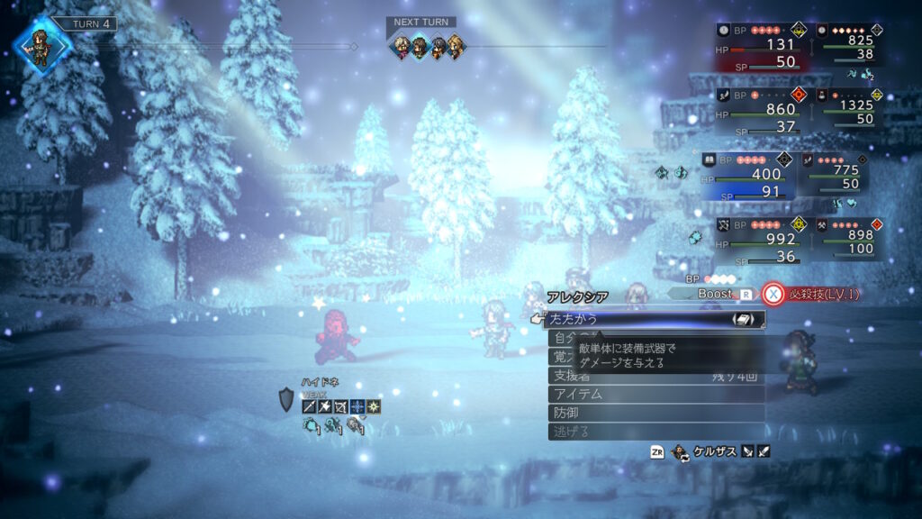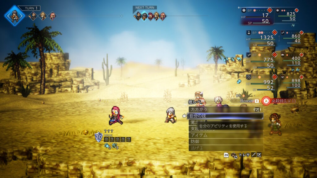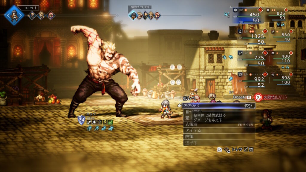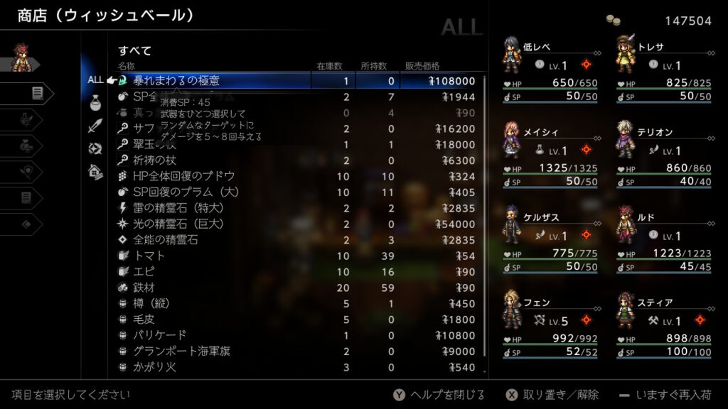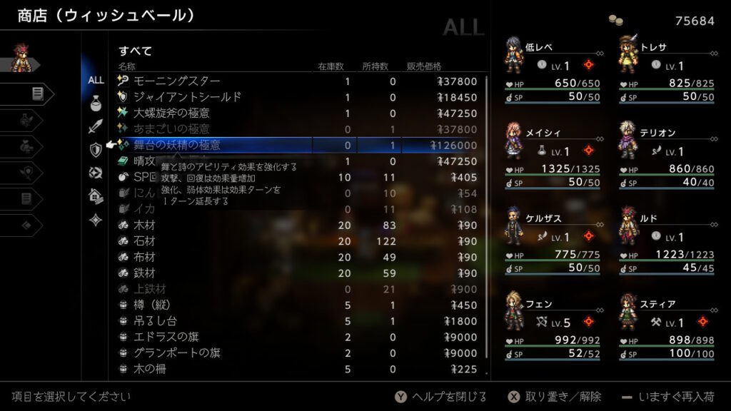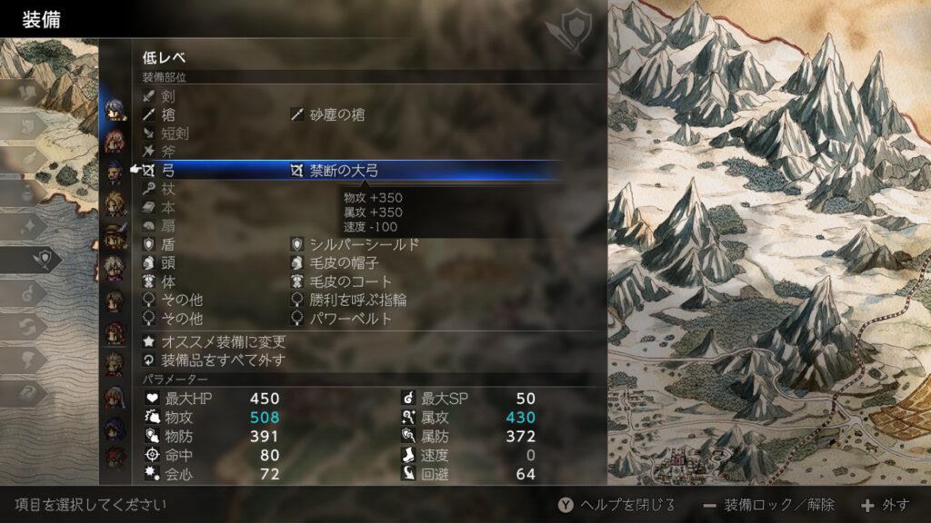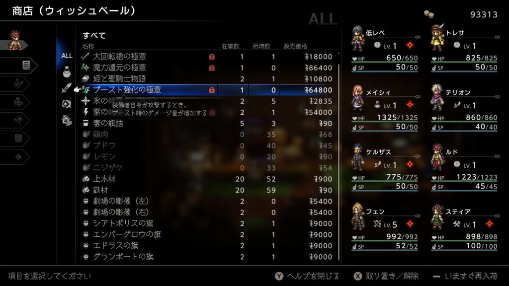 どうせ金策の最中に主人公が落ちた状態で逃走成功することが良くあるのでそのままウィッシュベールに戻ればHP1の限界背水を決めた状態にできるので、その状態でひたすらブースト3幸運の矢をしまくるだけです、装備やアビリティは下の通りです。主人公の後ろのキャラに極意化したBPプラスを装備しておきましょう。