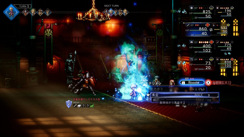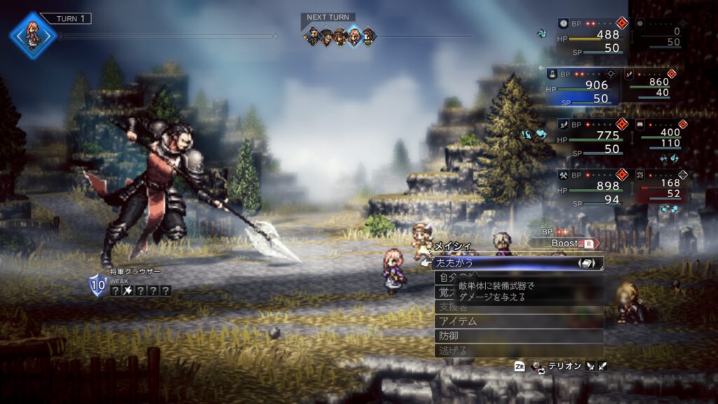 1ターン目は2回行動のうち1回しか攻撃してこないのでそこだけ耐えられる攻撃パターンを引ければ弓暴れまわるやさみだれ矢、雷5hit召喚1回目でシールドを次のターンにブレイクできるように削っておきましょう。
